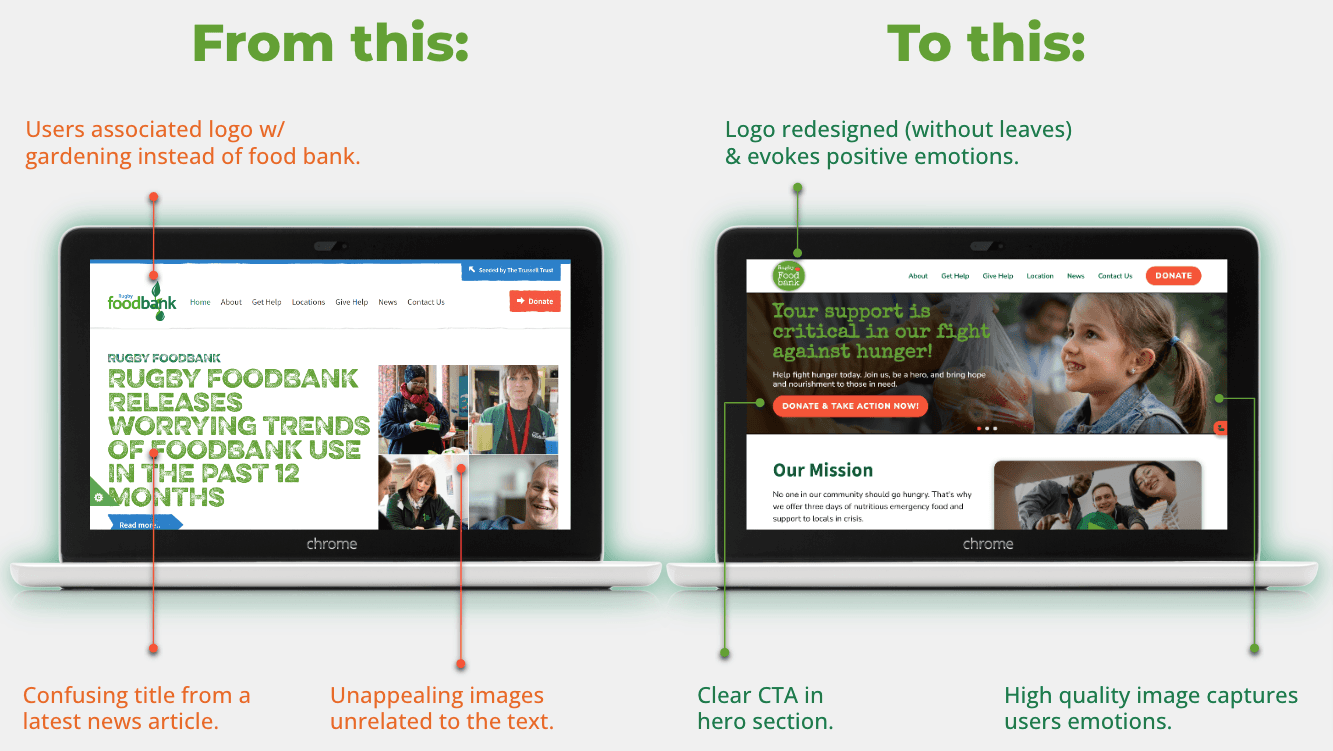 From the low fidelity test, we deduced that the location of the donate button was a bit confusing for users and users/interviewees complained that the hero page wasn't engaging enough.