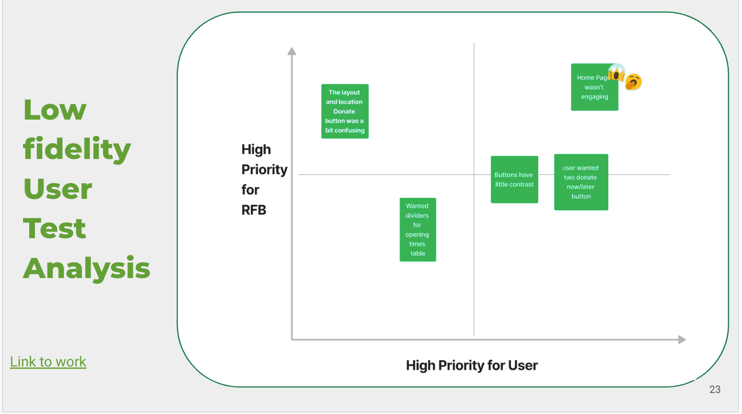 In conclusion, the research-focused project on understanding user behaviors while attempting to donate to a food bank has yielded valuable insights into the user journey and preferences. By placing a strong emphasis on research, we were able to gain a deep understanding of the challenges users face during the donation process and identify opportunities for improvement. Through user interviews, surveys, and usability testing, we uncovered key pain points and motivations that guide users' decision-making when contributing to a food bank. This data-driven approach allowed us to design a more user-centric donation experience that addresses the specific needs and expectations of our target audience.